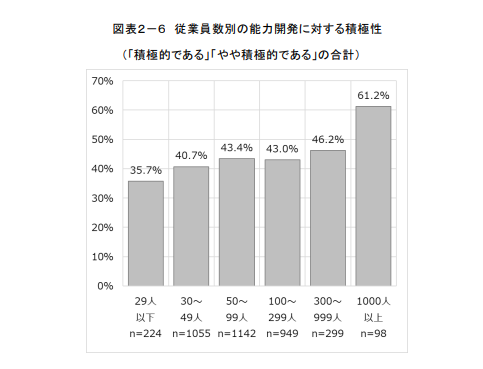 「企業のキャリア形成支援施策導入における現状と課題(2023年)」によると、従業員の能力開発に「積極的(「やや」を含む)」と回答した企業の割合は、従業員数が多い企業ほど高くなる傾向にあります。