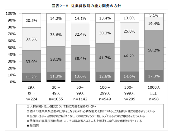 「個々の従業員が当面の仕事をこなすために必要な能力を身につけることを目的に能力開発を行っている」も「29 人以下」33.5%、「30~49 人」33.6%と従業員数が少ないほど多かった。一方、 「当面の仕事に必要な能力だけでなく、その能力をもう一段アップできるよう能力開発を行 っている」は「1000 人以上」58.2%が最も多かった。