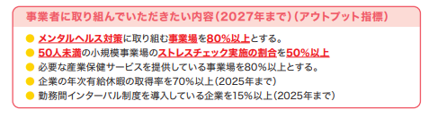 「第14次労働災害防止計画」において、50人未満の事業場に対するストレスチェック実施の目標値(アウトプット指標)は、「2027年までに50%以上」とされています。80%ではありません。
