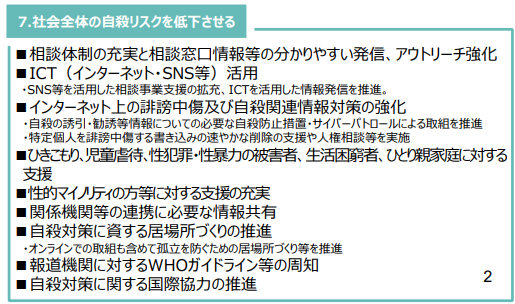 「自殺総合対策大綱(令和4年)」では、重点施策として、若年層への支援、女性への支援に加え、「性的マイノリティへの支援の充実」が明記されています。