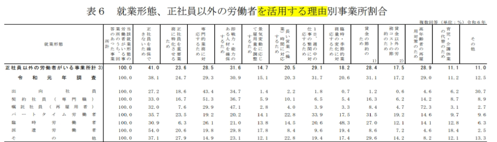 「令和6年就業形態の多様化に関する総合実態調査」では、正社員以外の労働者を活用する理由として、長年上位だった「賃金の節約」を「正社員を確保できないため」が上回る結果となっています。