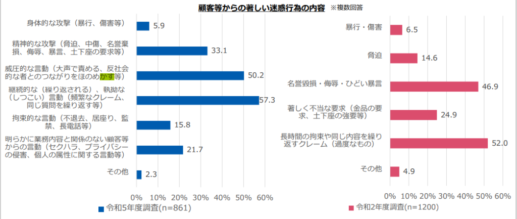 「令和5年度職場のハラスメントに関する実態調査」において、事案の内容で最も多かったのは「継続的な、執拗な言動(頻繁なクレーム、同じ質問を繰り返す等)」であり、次いで「罵声、大声を出す」などが続いています。