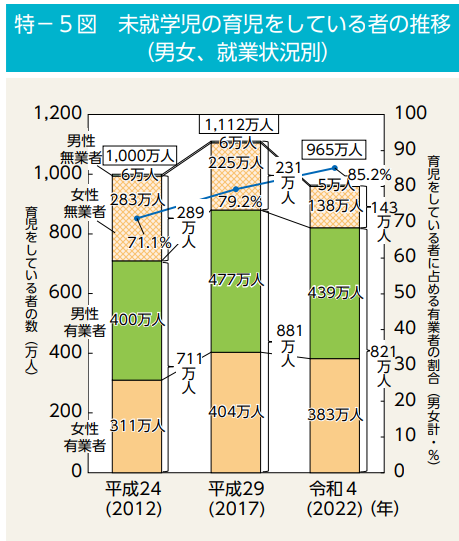 2022年のデータでは、未就学児の育児をしている女性の内訳は「有業者」が「無業者」を大きく上回っています。共働き世帯の一般化に伴い、育児と仕事の両立が進んでいる状況が示されています。