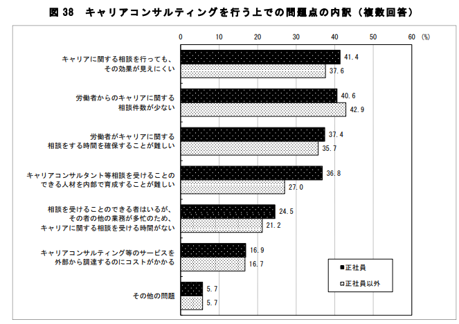 「令和6年度能力開発基本調査」において、キャリアコンサルティングを行う上での問題点として最も多い回答は、「キャリアに関する相談を行っても、その効果が見えにくい」 (正社員 41.4%、正社員以外 37.6%)、「労働者からのキャリアに関する相談件数が少ない」(正社員 40.6%、正社員以外 42.9%)の割合が高くなっている。(P24)