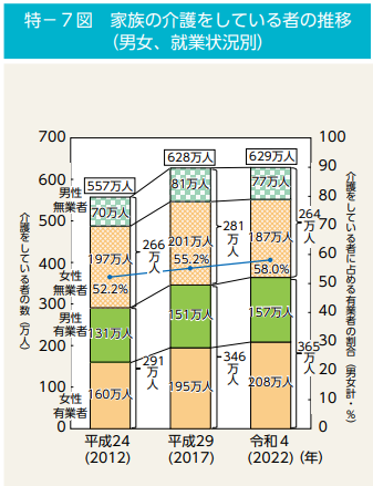 家族の介護をしながら働く「有業者」の割合は、男性・女性ともに増加傾向にあります。これは、仕事と介護の両立支援制度の整備や、現役世代の高齢化が背景にあります。(P12)