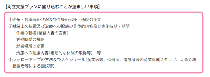 ガイドラインにおいて、両立支援プランには、労働者本人の意向を踏まえた具体的な措置(残業制限、時差出勤、テレワークの活用、職務内容の調整等)とその期間を明記することが望ましいとされています。