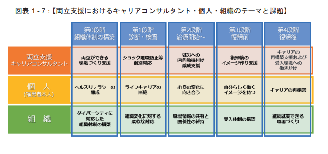 「第2段階(入院・治療中)」は、治療への専念とともに、職場との連絡体制の維持、復帰に向けた暫定的な見通しの共有などが行われるフェーズです。キャリアの再構築は、状態が安定する復帰前後から本格化します。